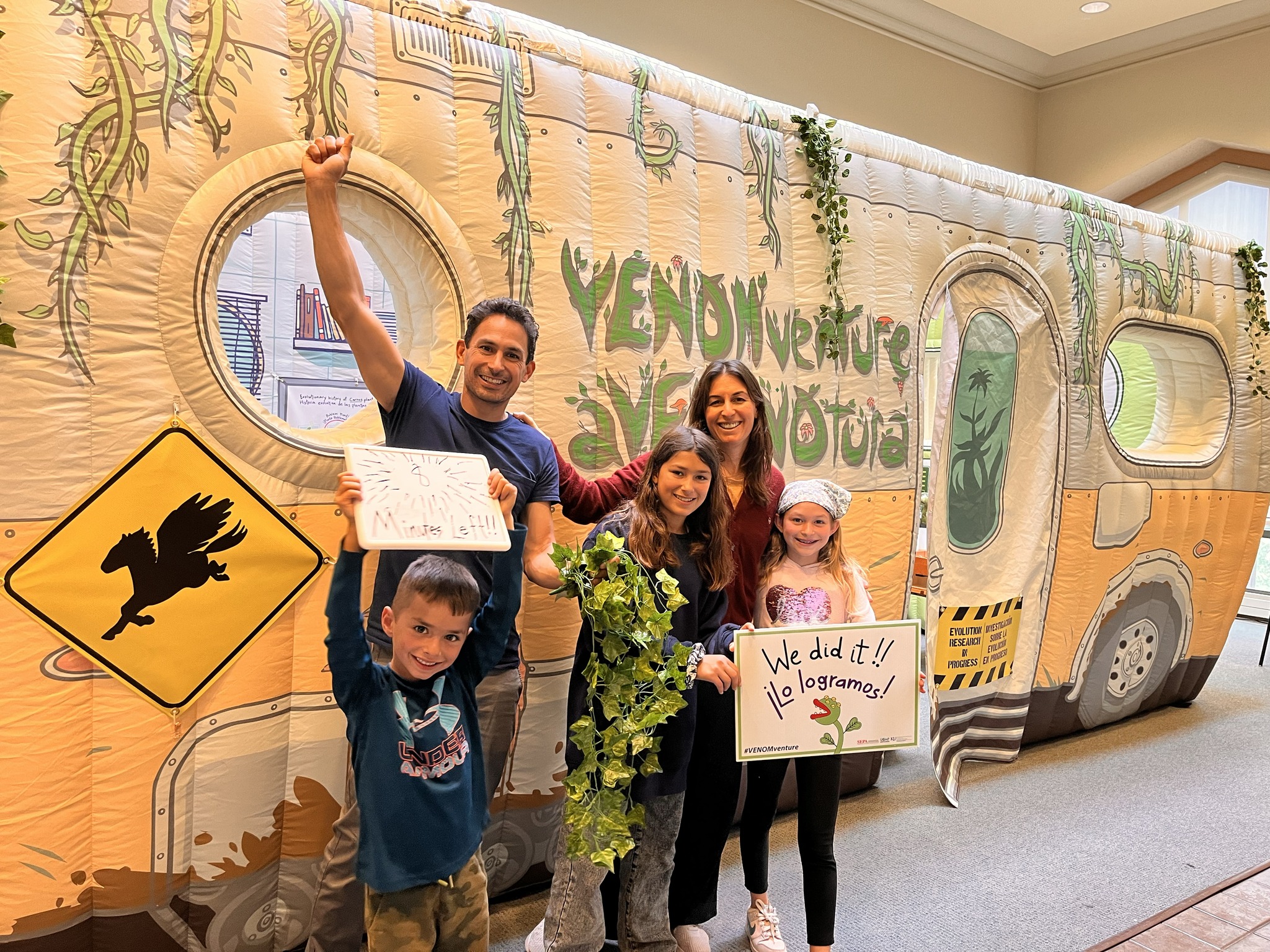 VENOMventure/aVENENOtura is an escape-style room that teaches English- and Spanish-speaking families key concepts in evolutionary biology through an engaging story, fun puzzles and delightful surprises. The game is designed to pop up at natural history museums and libraries in rural and urban communities, and it was hosted by the KU Natural History Museum in 2023. Its evidence-based design and broad adaptability make it a model for equity-focused informal learning across museum and libraries in diverse settings.